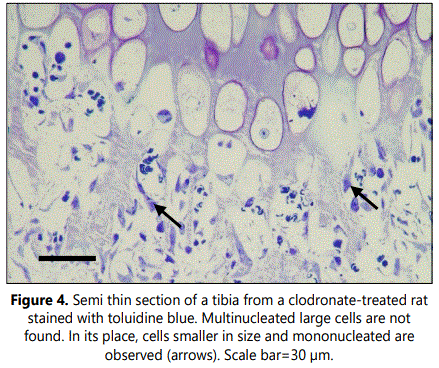 In the present work, we focused our attention on the primary spongiosa because it is the initial trabecular bone network that is first formed directly from growth plate cartilage. This first trabecular structure is composed of cartilage bars and woven bone and is subsequently resorbed and replaced by lamellar bone to produce the secondary spongiosa. We analyzed the effect of treatment with clodronate because it is one of the best known bisphosphonates that has been largely and effectively used for treating many osteometabolic disorders characterized by excessive resorption. Clodronate is metabolized by osteoclasts and induces the production of toxic analogs of adenosine triphosphate (ATP) that accumulate intracellularly in these cells, resulting in induction of osteoclast apoptosis [10,11]. On this basis, we hypothesize that inhibition of the resorptive activity of osteoclast-like giant cells induced by bisphosphonate treatment may affect the normal formation of the primary spongiosa derived from calcified cartilage.