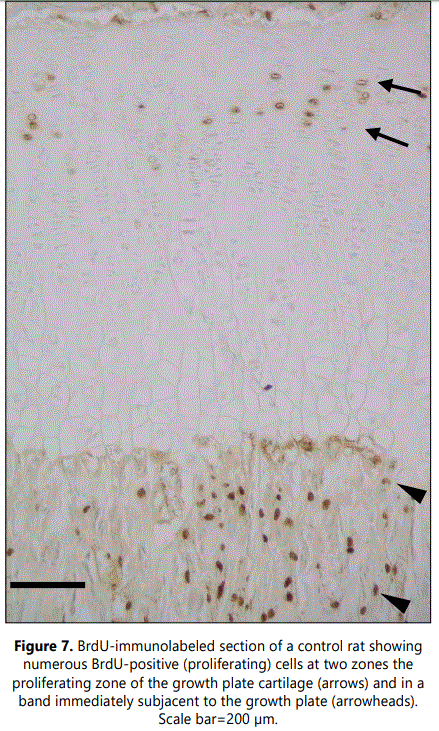 Determination of the rate of longitudinal bone growth was obtained by measuring the distance between the zone of vascular invasion in the growth plate and the proximal end point of the fluorescent label of calceine. Measurements of the distance between the zone of vascular invasion into the growth plate and the proximal end point of the calceine front were obtained at four randomly determined locations on each of the three sections per animal, and the mean of these measurements divided by 4, the number of days between calceine injection and killing, was considered the longitudinal bone growth per day in each animal. Likewise, the height of the growth plate was estimated by measuring its height at four randomly chosen locations on each section.