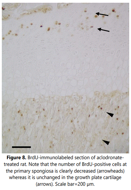 Examination of cell proliferation, assessed by BrdU incorporation, demonstrated two zones with high numbers of BrdUrd-positive cells (Figure 7). One corresponded to the region of the growth plate cartilage where chondrocytes undergo mitosis, the proliferating zone. The second was within the metaphyseal primary spongiosa, in a band immediately subjacent to the growth plate, and corresponded to osteoprogenitor cells capable of both proliferating and differentiating into bone-forming osteoblasts. Analysis of sections from clodronate treated rats revealed that the number of BrdUrd-positive chondrocytes in the growth plate cartilage did not change when compared with control rats. However, proliferation was found to be significantly decreased in the primary spongiosa of clodronate treated rats (Figure 8) (Table 1). Proliferating cells in the primary spongiosa included mesenchymal, osteoprogenitor, hematopoietic and vascular cells. Some of these cells migrate with the invading blood vessels into the hypertrophic cartilage and others generate osteoblasts that generate bone trabeculae at the primary spongiosa. Results obtained on the structure of growth plate and primary spongiosa showed that alteration was greater in the last than in the former, a fact suggesting that decrease of proliferating cells mainly affected to osteoprogenitor cells.