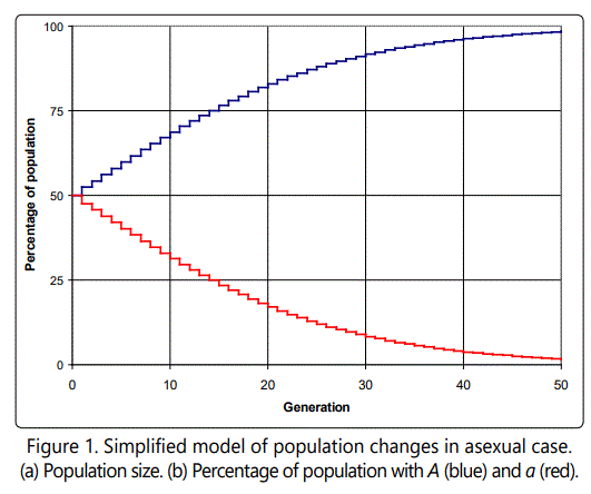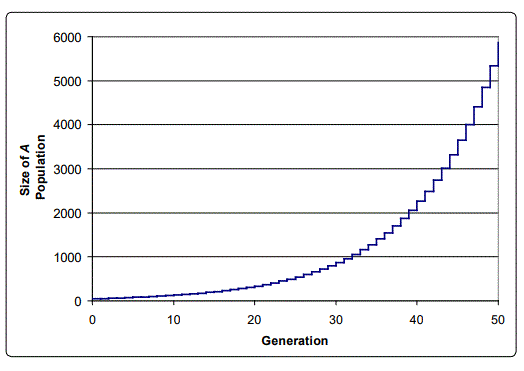 For concreteness sake, consider the following example. Assume that both A and a start with 50 individuals each in the population of 100. Let s = 0.1 (unrealistically high, but useful for this illustration). Then in the next generation, there will be 50(1+0.1) A's, and 50 a's. We can continue with further generations, repeating the calculation, and then calculate the percentage of A and a as generations (time) continue. The result is shown in Figure 1. Clearly, the selective advantage of A will cause its percentage to approach 100%, while the percentage of a's in the total population will dwindle down to near zero. In this case, the population of A's increases exponentially, as shown in Figure 1, though of course the percentage of A's in the population is limited to 100%.