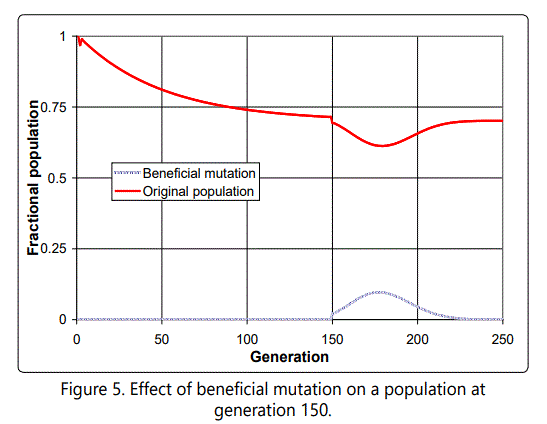 Note that this simple case illustrates the action of natural selection by itself, in the absence of deleterious changes or mutations; no assumption was made about the origin of the two genes A and a. They could have been part of the population's gene pool, or A could have arisen as a mutation of a.