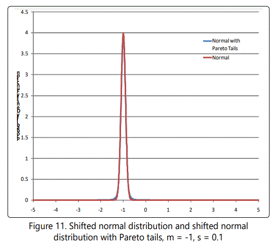 where x is expressed in units of σ, assuming without loss of generality that μ=0, since the resulting graph can be shifted to correspond to any desired value of μ. A plot is shown in Figure 10, which illustrates a normal distribution center with its usual tails and with heavy tails (Pareto distributed) grafted at ±2σ, and σ=1. Figure 11 shows the case of Pareto tails grafted at ±2σ, but with σ=0.10 and mean shifted to -1 (average selective value). This case is particularly interesting because it shows that "most" mutations would be deleterious (99.97%), and that the probability of getting a beneficial mutation of relative selective value 15 (x ≥ 16) is 8.3 x 10-8.