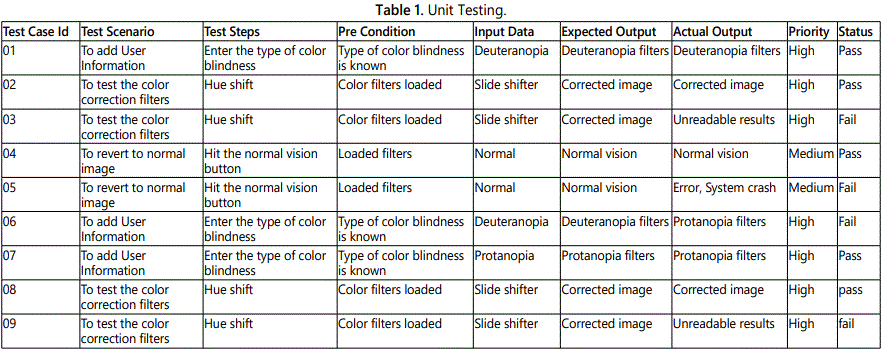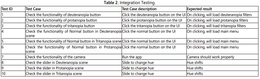 Unit testing is shown in table 1 and integration testing is shown in table 2.