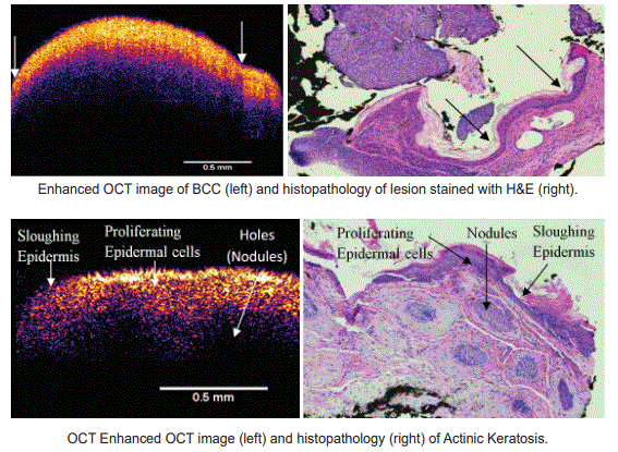It is concluded that the ratio of the resonant frequency squared to the tissue thickness obtained from VOCT can be used to grade the type of tissue response seen. Further studies are underway to establish the relationship between tissue stiffness and lesion morphology for cellular and fibrotic lesions based on the characteristic ratios of resonant frequency and tissue thickness. Enhanced OCT image of BCC (left) and histopathology of lesion stained with H&E (right). OCT Enhanced OCT image (left) and histopathology (right) of Actinic Keratosis.