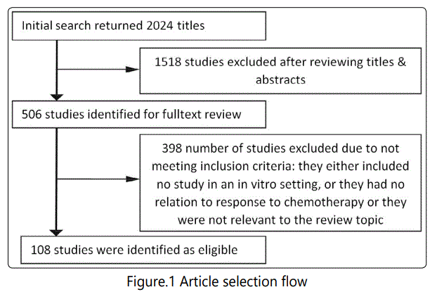 Baseline Characteristics of Included Studies: A total of 2024 studies were identified primarily, from which 1518 were excluded after reviewing titles and abstracts. Then, 398 studies were excluded after full-text review. Finally, 108 studies were included (Figure 1) [6-113]. The included studies were all published between 2003 and 2017. Finally, 178 miRNAs with a report on their potential association with GC treatment efficacy in an in vitro setting have been identified. The miRNA association to chemotherapy response had been studied in the following methodologies: