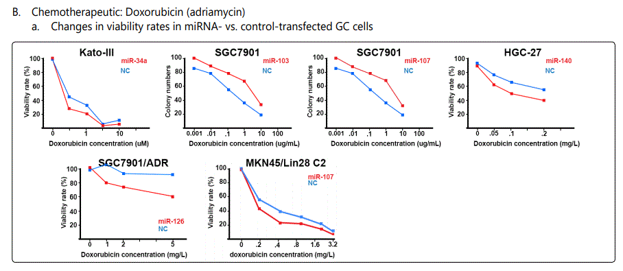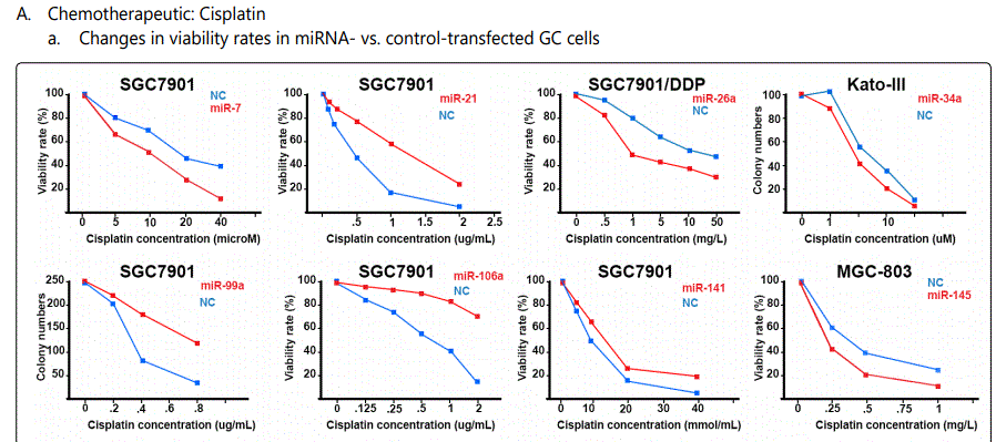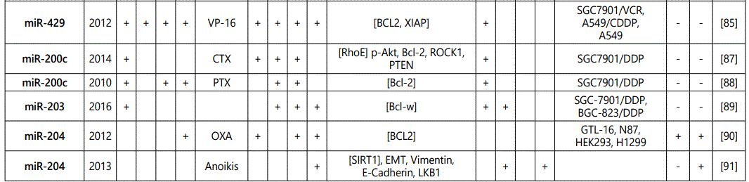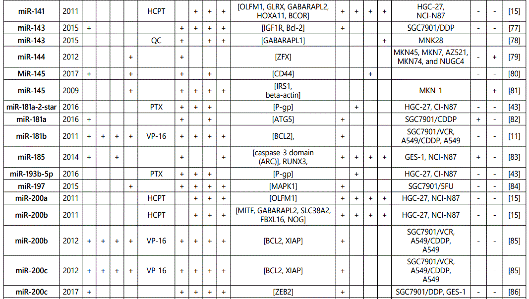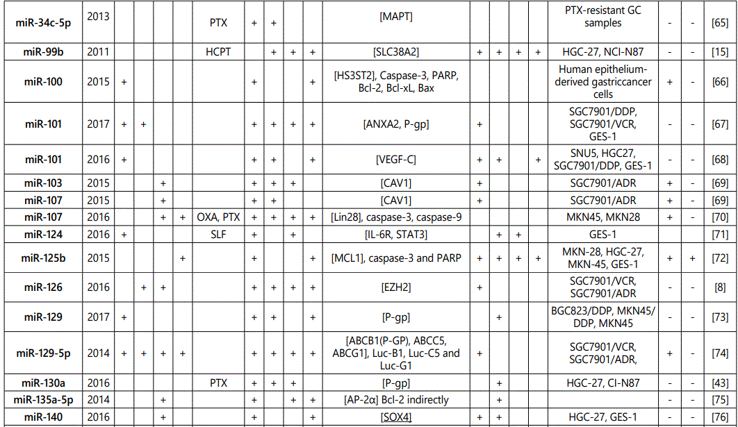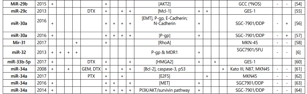 miR-181a: Two studies reported miR-181a as a chemosensitivity predictor for paclitaxel [43] and cisplatin [82] therapy, while another study reported its upregulation in SCG7901/DDP and BGC-823/DDP. Further studies would be needed for elucidations.