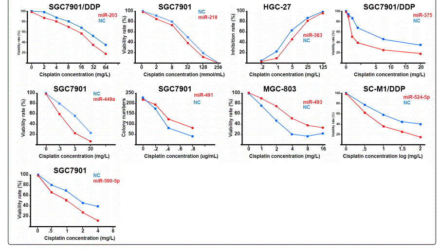 miR-107: Two studies reported miR-107 as a positive multidrug modulator in GC cell lines to adriamycin, 5-fluorouracil, oxaliplatin and paclitaxel [69, 70], one study [9] reported its upregulation in either SGC7901/DDP or BGC-823/DDP versus their parental cells. The disparity in the chemotherapeutic agentsunder investigation suggests that miR-107 might have differential effects in chemoresponse to different agents.
