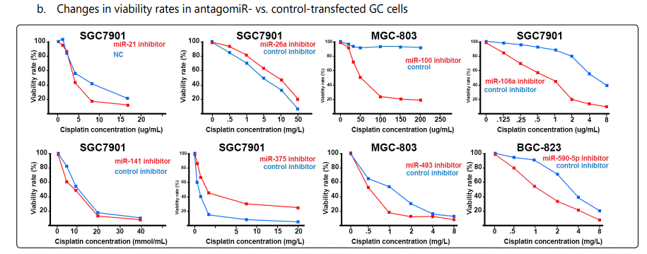 Difference observed between subtypes of particular microRNAs: There are reports in which subtypes of some specific miRNAs conferring different effects on chemotherapy efficiency in GC cell lines. Here is a list of them: miR-196 vs. miR-196a; miR-181a vs. miR-181c\d; miR-106a vs. miR-106b; miR-99a vs. miR-99b; miR-17 vs. miR-17-5p; miR-23a vs. miR-23b; miR-190 vs. miR-190b; miR-193-5p vs. 193-3p; miR-424 vs. 424-3p; miR-let7g vs. miR-let-7a& miR-let-7b.