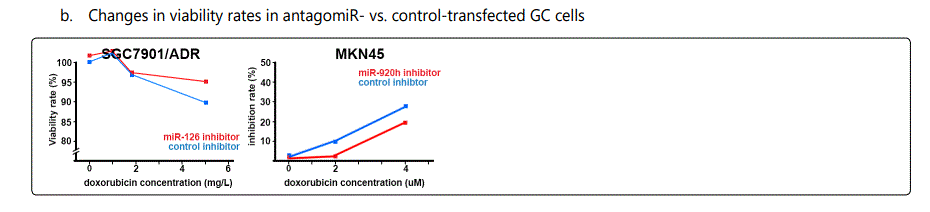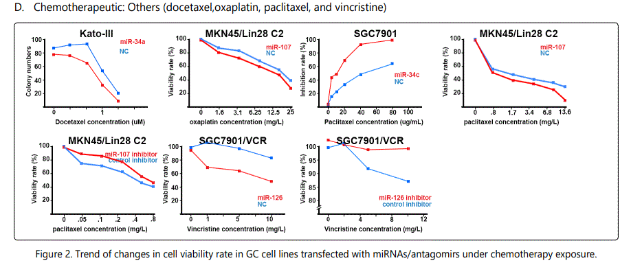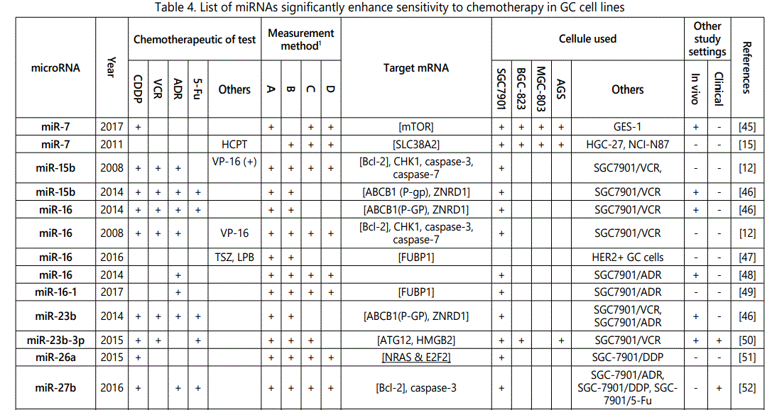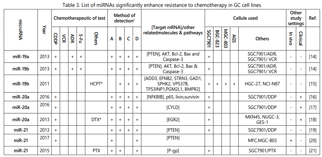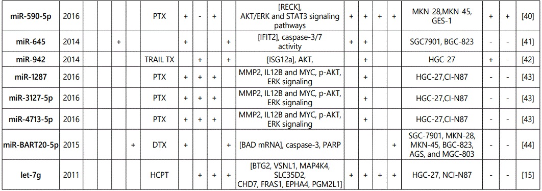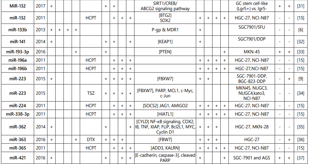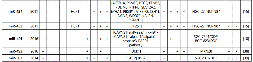 miR-452: There are two studies on the modulation effects of miR-452 in GC cell lines: One suggesting it as a resistance indicator to hydroxycamptothecin [15], while another one associated it to increase chemosensitivity to paclitaxel. Further studies in different aspects of the observed disparity, including on the metabolic pathways through which these two chemotherapeutic agents work, may to some degree explain the identifieddifference.