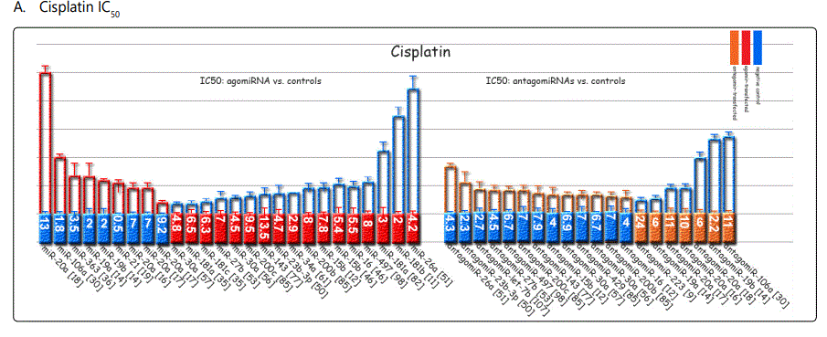 Method A: Differential response to a chemotherapeutic agent detected by alterations in the proliferation/growth rate or colony formation by either up- or down-regulation (i.e. by transfection) of the respective miRNA in a cell line;