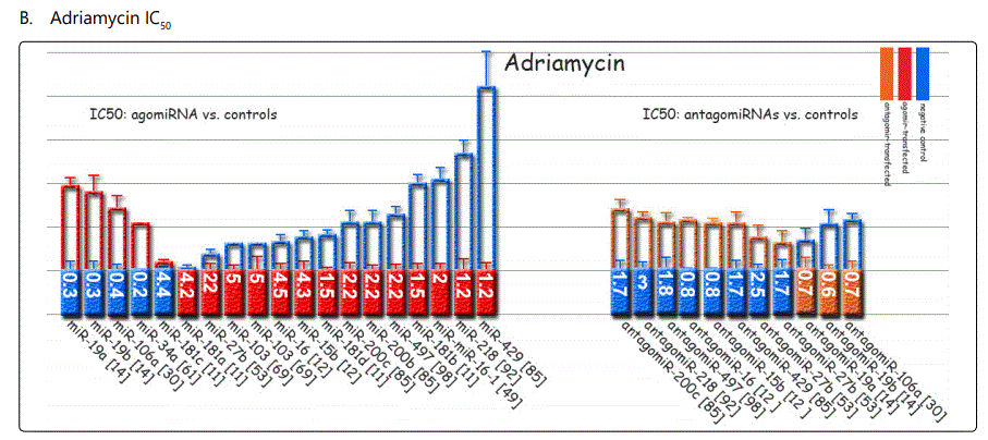 Results: miR-223, miR-196, miR-92 and miR-181a show the highest up-regulation rates in GC cell lines resistant to cisplatin vs. parental cells.The miRNAs with the highest apoptosis induction rates due to cisplatin therapy included miR-200b, -497, -200c, and -429 respectively, all have a common target of proto-oncogene Bcl-2. Allthe three miRNAs inducing the highest resistance to adriamycin in GC cell lines (-19a, -19b, -106a) have a common target of PTEN, while all the three antagomiRs (-200c, -218, -497) conferring highest sensitivity to doxorubicin target Bcl-2.Among miRNAs with the lowest IC50 modulation for agomiRs (miR-429 and -27b), both of them target Bcl-2; and the highest IC50 was found for antagomiRs antagomiR-27b & -23b-3p.