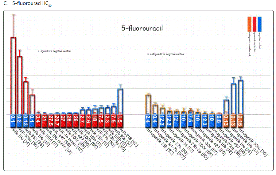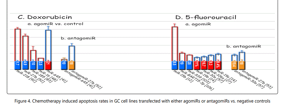 Response to 5-fluorouracil (5-FU): The list of miRNAs dysregulating the 5-FU resistant GC cell lines are summarized in tables 1 & 2. Tables 3 & 4 summarize chemoresponse to upor down-regulation of several miRNAs performed through transfection with agomiRs or antagomiRs, respectively. Figure 2.C. plots cell viability rates in GC cell lines transfected as abovementioned in the context of 5-FU therapy. The chemomodulation associates of 5-FU determined through differential response in IC50 levels or apoptosis rates are not very specific and is quite similar to that of adriamycin, suggesting existence of a cross-response for the two agents in GC cell lines (Figures 3.C & B and 4.C & D). A strange observation about 5-FU induced apoptosis by miRNA modulation was that, in one study [57], transfection by either agomiR- or antagomiR-30a, both induced resistance to apoptosis (figure 4.D.a & b).