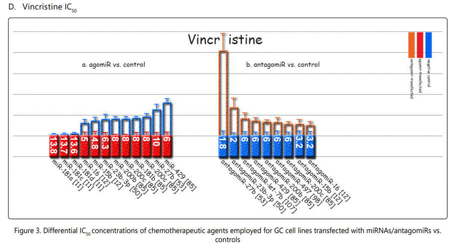 Response to vincristine: Table 2 lists the miRNAs downregulated in the chemo-resistant GC cell lines, among which, those regulating resistance to vincristine therapy represent the lowest expression. miR-15b, miR-33a, miR-220, and miR-612 all represent less than 30 times expression in the vincristine-resistant GC cell lines versus the parental cells. As can be simply conceived from figure 3.D, no miRNA had been reported modulating increased IC50 doses for vincristine vs. controls in GC cells. Among miRNAs with the lowest IC50 modulation for agomiRs (miR-429 and -27b), both of them target Bcl-2. The highest vincristine IC50 were found for antagomiR-27b (targets CCNG1 & dysregulates p53) & -23b-3p (targets: ATG12 & HMGB2) transfected GC cell lines.