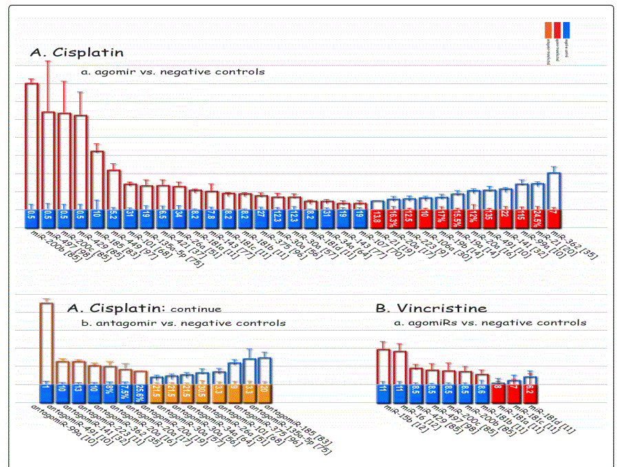 *Reports have been arranged in the decreasing order for chemo-resistance induction for agomiRs and chemo-sensitizing trend for antagomiRs; figures associated with non-significant difference have also been shown.