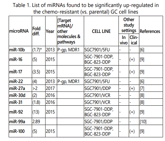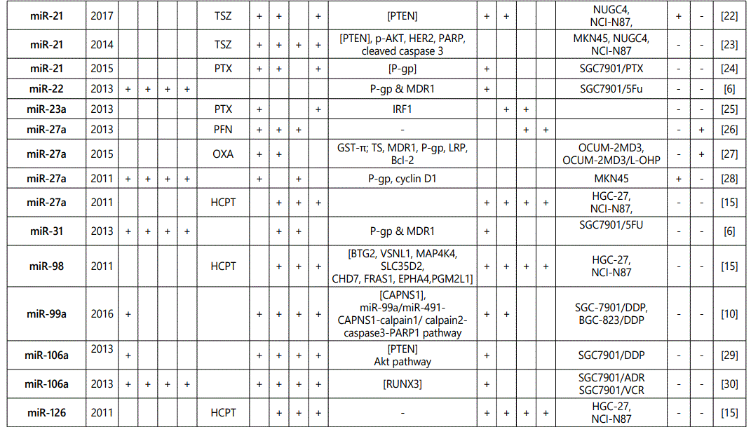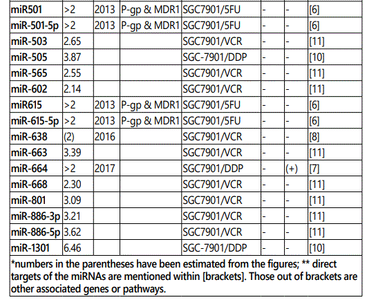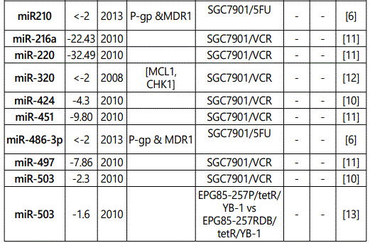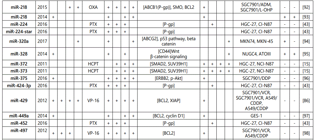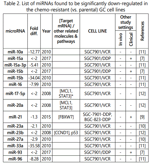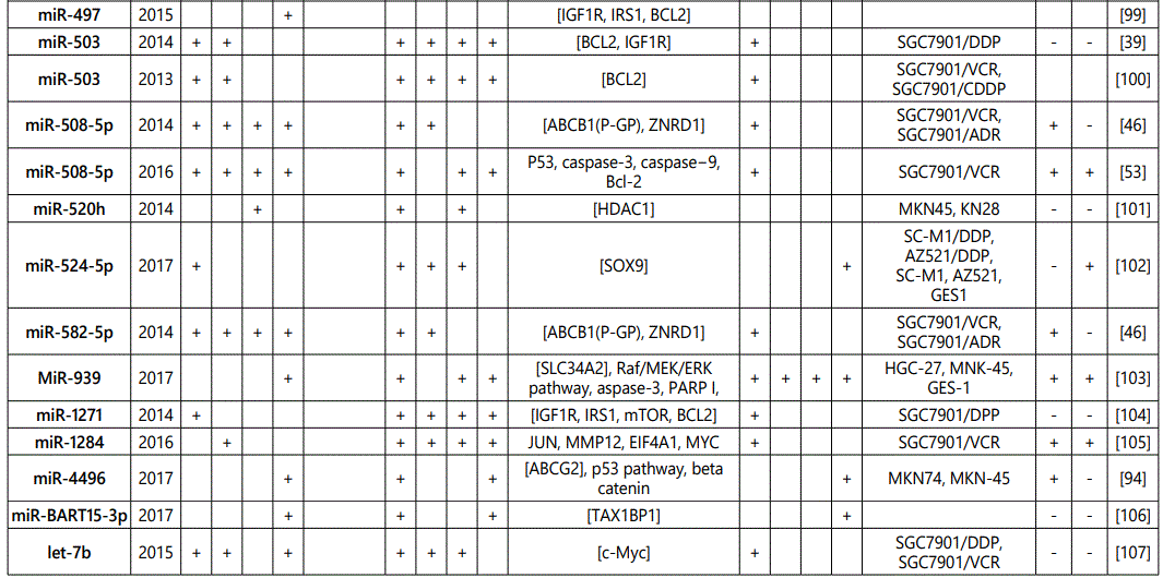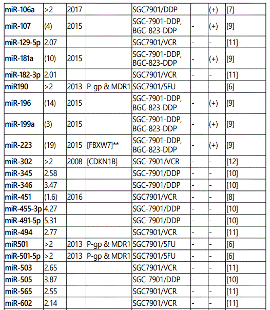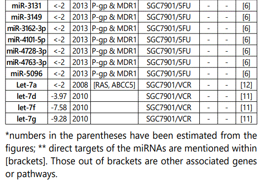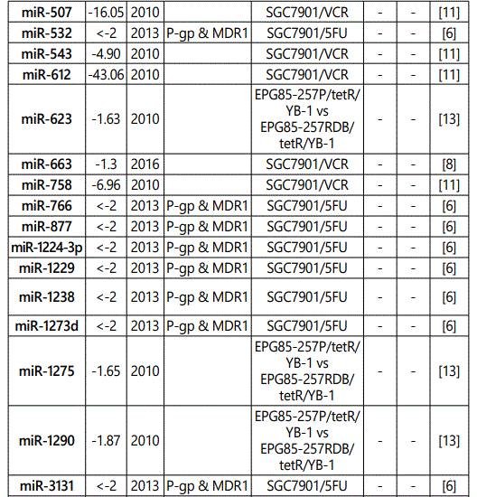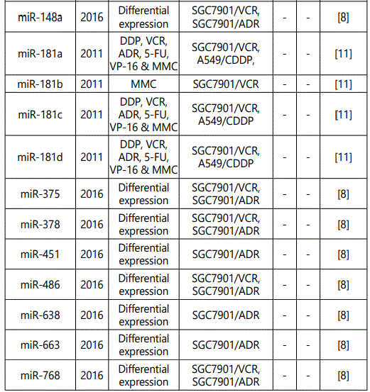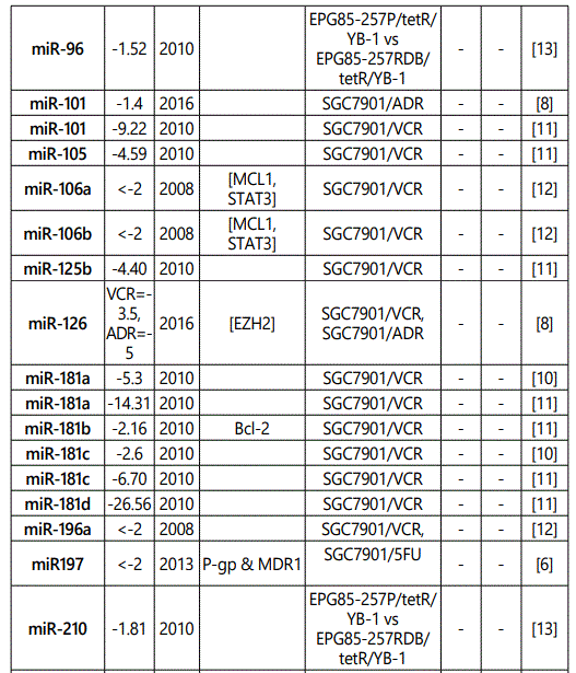 miR_106a: While three studies [7, 29, 30] reported miR-106a as a resistance conferring miRNA to multiple drugs (including its up-regulation in SGC79-1/VCR cell line), one another study [12] reported its downregulation in SGC7901/VCR cell line versus parental cells. Therefore, future studies are recommended.