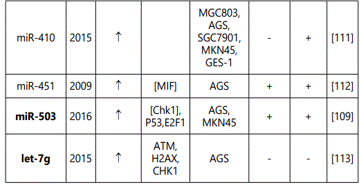 miR-let-7g: Two studies reporting controversial effects for miR-let-7g have been found in this systematic review. While in one study it has been associated with chemo-resistance to hydroxycamptothecin therapy [15], another one suggests it as a positive modulator of sensitivity to radiotherapy in GC cells lines [113].