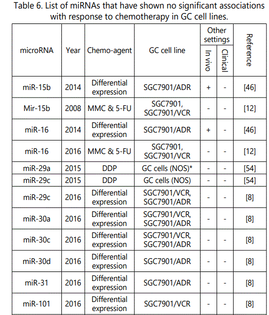 miR-16: While in one study, miR-16 had been reported to be over-expressed in either SGC7901/DDP or BGC-823/DDP versus their parental cell lines [9], in four studies [12, 46-48] it had been associated with chemo-sensitivity inductions. Nonetheless, it is very important to notice that in none of the four studies mentioned, cisplatin resistance had been investigated, and cell lines resistant to Adriamycin, vincristine, and/or trastuzumab had been used. A simple explanation could be that miR-16 could confer chemoresistance to cisplatin but it offers chemo-sensitivity to the other chemotherapeutic agents, above mentioned.