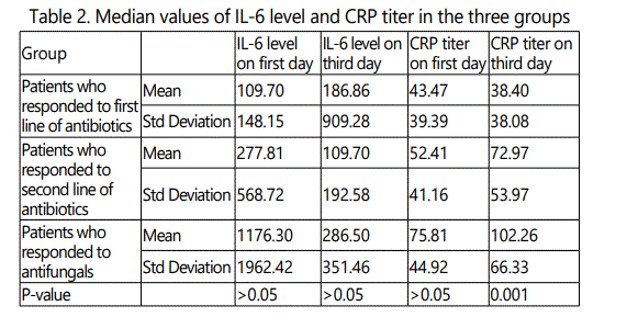 There was no significant difference between IL-6 level on first and third day in the three groups (P>0.05). Also there was no significant difference in CRP titer on day one (P>0.05), but CRP titer on the third day was significantly higher in the group who needed to receive antifungal drugs (P=0.001).