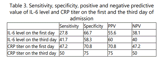 Sensitivity, specificity, positive and negative predictive value of IL-6 level and CRP titer on the first and the third day are summarized in table 3.