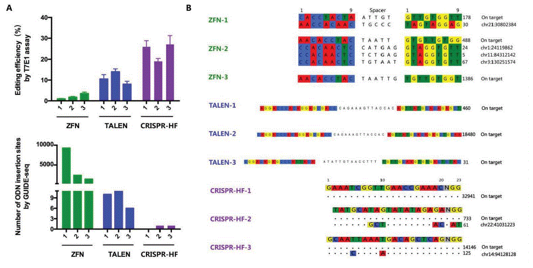 Methods: In this study, we chose three genes and designed three different sites for the same gene targeted by ZFN, TALEN and High-fidelity CRISPR (CRISPR-HF) separately. After evaluating the editing efficiency by T7E1 assay, we used the unbiased, genome-wide and sensitive DSB detection approach–-GUIDE-seq to compare their on-target and off-target profiles for total 9 different nucleases in SiHa cell line.