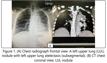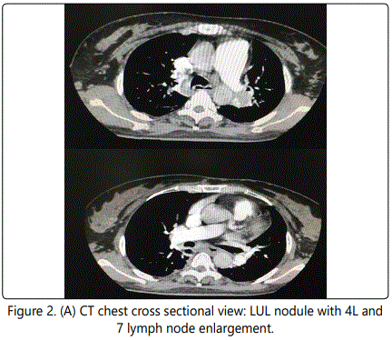 A 44-year-old Thai female, who was diagnosed alcoholic cirrhosis, Child-Pugh score of 7 for 2 years, presented with clinical of high grade fever, abdominal pain and abdominal distension. The abdominal paracentesis was performed and diagnosed spontaneous bacterial peritonitis (SBP). She was given intravenous cefotaxime for SBP treatment. During work up for cause of fever, the chest radiograph (CXR) was done and showed left upper lung nodule closed to aortic knob and the decrement of left lung volume which deferred for left upper lobe atelectasis (Figure 1A). She had no history of respiratory symptoms and no history of tuberculosis or tuberculosis exposure. She is non-smoker. Her past medical history was not significant except her liver condition which was treated with low dose spironolactone 50 mg per day. Her family history was noncontributory. Her physical examination was slightly decrease breath sound at left upper lung. Laboratory studies showed leukocytosis of 17,800 cells/ul. Sputum and blood culture were negative. Sputum smear acid fast bacilli for three days were negative. Sputum culture for tuberculosis was negative. Computerized tomography (CT) of the chest was performed and revealed a 2 centimeters enhancing intrapulmonary nodule involved left apicoposterior bronchus with intraluminal extension caused sub segmental atelectasis with fluid filled bronchi distal to lesion (Figure 1B). There were left paratracheal (4L) and subcarina (7) lymph nodes enlargement, 1 and 1.4 cm, respectively (Figure 2A and B). No evidence of metastatic disease was seen.