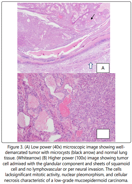 Introduction: Mucoepidermoid carcinoma (MEC) of the lung is a rare form of lung cancer that is classified into low grade andhigh grade based on histological features. MEC and adenoid cystic carcinoma are considered to be salivary gland-type neoplasms. Surgical resection is the primary treatment for low-grade MEC with excellent outcomes, while high-grade MEC is a more aggressive form of malignancy.