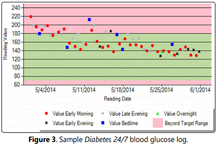 The project's expected outcomes were evaluated through descriptive (e.g., mean, median, mode, and standard deviation) and inferential (t-test) statistics analysis of the blood glucose values to determine whether there was a statistically significant difference between blood glucose levels at beginning and end of the study. In addition, demographic data were analyzed to describe the sample of participants. The blood glucose data was extracted from the Diabetes 24/7 blood glucose log of each patient. Figure 3 is a sample of a patient record created and maintained using the Diabetes 24/7 monitoring system.