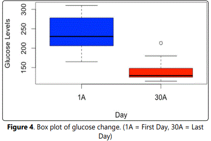 The mean glucose level for the first day was 237.2 (45.02) and for the last day was 138.0 (21.74). Before inferential testing, the normality assumption of the glucose levels for both days was tested using the Shapiro-Wilks Test assuming a null hypothesis and normal distribution. However, the distribution for the last day was not normal, so a dependent t-test was not used. A dependent Wilcoxon Signed-Rank test was used to test the differences between the first and last days. Because the data was paired (meaning that it is the same person but different observations for the two days), the dependent test was chosen. With a null hypothesis that glucose levels were equivalent on both days, the test calculated a p-value of 0.00008. This indicates that the null hypothesis would be rejected, signifying a significant difference in glucose levels between the first and last days.
