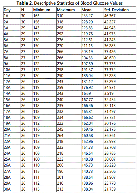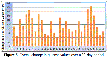 The overall blood glucose values for the sample population ranged from 110-318 mg/dl and the observed changes in glucose values ranged from 40-185 mg/dl over the 30-day study period.