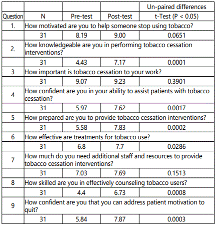 A statistical difference was seen in six of the nine pre-posttest questions. The questions asking participants how motivated they are to help someone stop using tobacco did not show statistical significance (P = 0.0651). Additionally, the questions “How important is tobacco cessation to your work?” and “How much do you need additional staff resources to provide tobacco cessation interventions?” did not show a statistical difference with a P value = 0.3901 and 0.15.13 respectively.