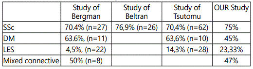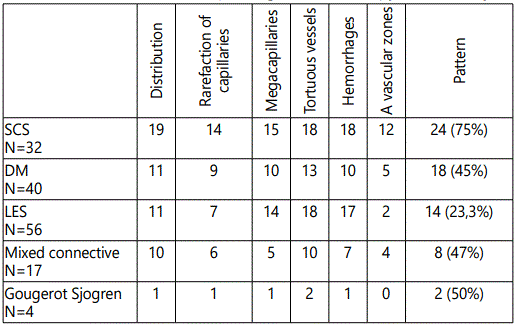 The sensitivity and specificity of dermoscopy in the diagnosis of systemic diseases has been proven in several studies such as that of Bergman et al. [1], carried out in 106 patients and 170 controls, and which objectified a sclerodermiform pattern in 19/27 patients. Patients with scleroderma (70%), 7/11 (64%) of those with dermatomyositis, 4/8 (50%) with Sharp syndrome, 2/38 (5%) with RP alone, and no subject controls. Periungual dermoscopy in systemic diseases looks for the same abnormalities as in capillorscopy, namely megacapillaries, dilated and branched vessels, haemorrhages and avascular zones in advanced forms, notably in systemic scleroderma [2]. A sclerodermiform pattern is defined (according to Maricq criteria modified by Bergman et al.) [1,3]. Presence of at least 2 following anomalies: megacapillaries, micro haemorrhages, architectural disorganization of the capillary distribution, moderate or extensive loss of the capillaries, tortuous capillaries, crossed or branched. Several studies in the literature have analyzed the perungual dermoscopy in systemic diseases including that of Bergman, Beltran and Tsutomu [1,4,5]. Our results were almost similar for the sclerodermiform pattern in systemic scleroderma and mixed connective tissue with a percentage of ≈70% and 50% respectively, a lower percentage for dermatomyositis (45%), and more important for lupus erythematosus (23%), 85% compared to other studies (Table 2). Sclerodermiform pattern analysis in Sjogren Goujerot syndrome has never been described in the literature found in 50% of our patients. However, there are several factors that limit the penetration of the light beam, thus preventing the visualization of the loops and make the examination difficult are the skin pigmentation, the epidermal thickening of the manual worker, the recent care of manicure, the application of varnish or henna on periungual areas.
