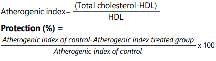 After 14 weeks, blood samples were collected from the marginal vein of the pinna of overnight fasted rabbits in EDTA (ethylene diamine tetra acetic acid) vacutainers. The plasma was separated immediately and subjected to estimation of lipid profile. Total cholesterol (TC), high density lipoprotein cholesterol (HDL-C) and triglycerides (TG) were estimated on autoanalyser (Konelab 30i, Trivitron) by enzymatic methods using kits by Randox [13]. Homocysteine was estimated by immunoassay using direct chemiluminometer [14] (Advia Centaur, Siemens). Atherogenic Index (AI), which is a measure of the atherogenic potential of an agent [15], and protection percentage were calculated using the following formulas and the results were tabulated.