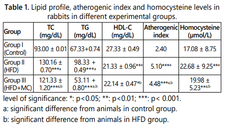 Results: MC significantly lowered the TC and TG levels in Group III rabbits as compared to Group II. In rabbits fed on HFD, Homocysteine and TC were significantly increased.
