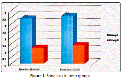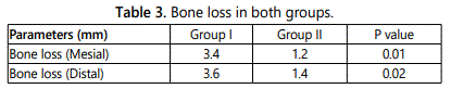 Table 3 shows that in group I there was 3.4 mm bone loss on mesial side and 3.6 mm on left side. In group II, there was 1.2 mm bone loss on mesial side and 1.4 mm on distal side. The difference was significant (P<0.05) (Figure 1).