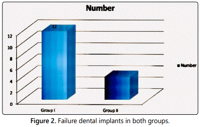 Figure 2 shows that there were 12 dental implants failure in group I and 4 in group II. The difference was significant (P<0.05).