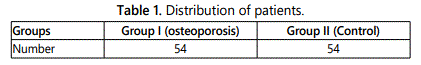 Table 1 shows that group I was osteoporosis group and group II was control group. Both groups had 54 subjects each.