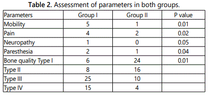Table 2 shows that 5 patients in group I and 1 in group II had mobility, 4 in group I and 2 in group II had pain, 1 in group I had presence of neuropathy and 2 in group I and 1 in group II had paresthesia. In group I, most common bone type was III seen in 25 patients and in group II was type I seen in 24 patients. The difference was significant (P<0.05).