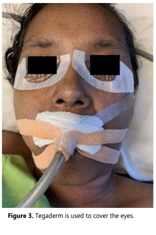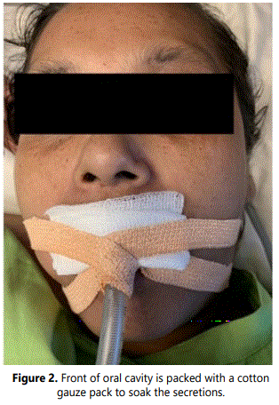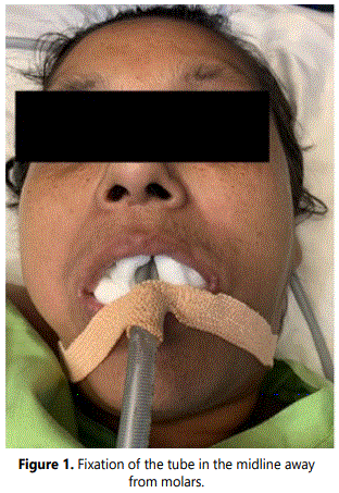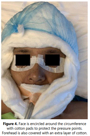 Supportive padded headrests and head elevation are recommended measures to minimize inappropriate pressure on the face. However, these are not always possible as spine flexion especially at lumbar region is sometimes required for adequate access during spinal surgery, thus increasing pressure on the face. We would like to highlight our innovation to prevent head and neck injuries during prone positioning (Figures 1-4). We fix the tube in midline away from molars instead of keeping itunilaterally at one side. Hand rolled gauze pads are put on both sides of tube as bite block. Front of oral cavity is packed with a cotton gauze pack to soak the secretions. Another rectangular shaped gauze pack is put on lips around the tube to prevent injury to lips. Tegaderm is then used to cover the eyes. Face is encircled around the circumference with cotton pads to protect the pressure points. Forehead is also covered with an extra layer of cotton. After this, the patient is turned to prone position without further head elevation. All these measures help in providing injury free anaesthesia to the patient in prone position.