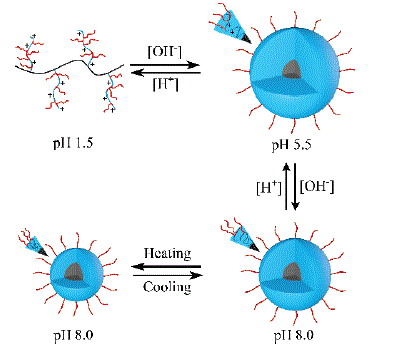 Illustration of the thermo and pH dual-responsive behaviors of the starch-g-P(DEAEMA-co-PEGMA) micelles.