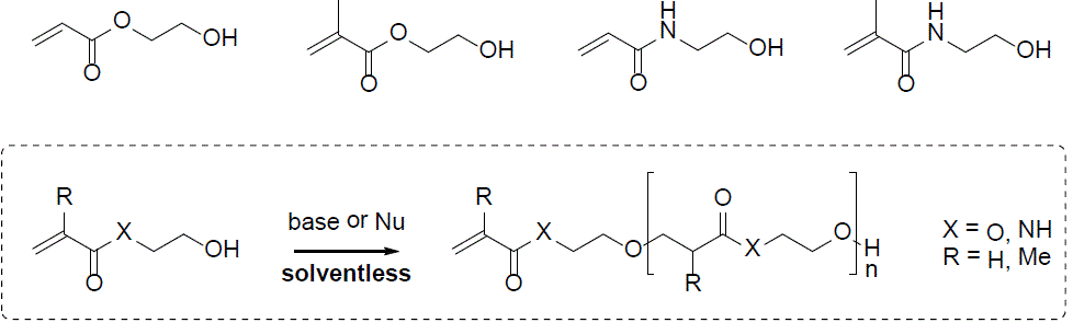 Herein we aim at changing the Michael acceptor from divinyl sulfone to other electron deficient olefins such as acrylates, methacrylates, acrylamides and methacrylamides as depicted below. In particular we were interested whether an addition polymerization reaction is feasible with these Michael acceptors. In particular we were interested whether an addition polymerization reaction is feasible with Michael acceptors being distinctly less reactive than divinyl sulfone. In particular, the role of the different nucleophiles and/or bases needed to initiate or catalyze the reaction is studied as the decisive factor for successful Oxa-Michael addition polymerization.