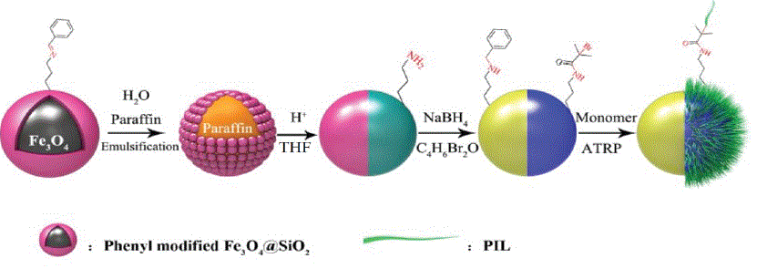 Illustration synthesis of the poly(ionic liquid)s modified magnetic Janus particles. The hydrophobic phenyl modified Fe3O4@SiO2 magnetic particles are used to stabilize the emulsion and form single layer at the oil-water interface. Janus particles are fabricated after the side in the aqueous phase is converted to amino groups. Following, the amino side is selectively modified with poly(ionic liquid)s to achieve poly(ionic liquid)s modified Janus particles.