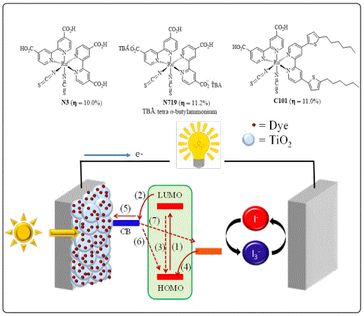 The concept of treating semiconductors with dyes was introduced in late 1960s mainly due to their spectra responses, which were mostly in the ultraviolet region resulting in low conversion efficiencies [18-21]. Although, these cells appeared as promising renewable energy resource, it was not considered until 1991 when O’regan B and co-workers reported the first efficient DSSC device that was fabricated by using a ruthenium-based dye anchored to the nanoporous TiO2 surface, which showed a high PCE ranging from 7.1 to 7.9% [22]. Hereafter, the initial synthesis of new dyes for DSSC applications were based on ruthenium with different ligands (i.e. N3, N719 and C101 dyes, see figure 3), followed by the use of metal-free dyes [23-25]. The record efficiency for DSSC of 14.3% was reported in 2015 using organ silicon dye and a co-sensitizer based on triphenylamine with carboxylic units as anchor group [26].