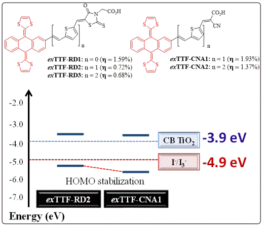 Following these strategies, we studied the changes in the optical and electrochemical properties upon the incorporation of different highly conjugated donor and co-donor systems linked to anchoring units’ as cyanoacrylic acid, rhodanine-3-acetic acid and acceptor systems without carboxylic groups with strong absorption in the visible range. Among the highly conjugated donor, ex TTF is one of the most studied systems due to its wide absorption spectrum, low oxidation potential and easy functionalization [39]. In 2014, we reported the synthesis of exTTF-based dyes endowed with a rhodanine 3-acetic acid unit as the acceptors and their further DSSC application, finding that the driving force for dye regeneration was negatively affected, because the difference between the first oxidation potential (HOMO) of the dyes and the I-/I3 redox couple was very small, resulting in a low PCE ranging from 0.68-1.59% [40]. The replacement of the anchoring unit based on rhodanine 3-acetic acid by cyanoacrylic acid resulted in a HOMO stabilization, which increased the driving force for dye regeneration (see figure 4) [41].