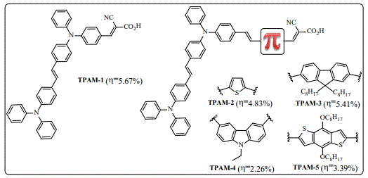 Considering the low oxidation potentials of the exTTF-based dyes that led to low conversion efficiencies in a typical DSSC device, even though such dyes showed a great absorption property in the visible range, the design of new efficient donors with co-donor systems for increasing molar absorptivity coefficients in the visible range was necessary. In 2015, we reported organic dyes based on two units of triphenylamine (TPA) as co-donor-donor (co-DD) with different π-spacers linked to cyanoacrylic acid as anchoring unit to the TiO2 (Figure 5) [42]. The devices fabricated with theses dyes showed good PCE values ranging from 2.26-5.67% whereas the ruthenium-(N719) based devices displayed a PCE value of 6.31%.