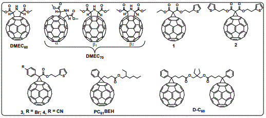 - Castro E, Fernandez-Delgado O, Arslan F, et al. New thiophene-based C60 fullerene derivatives as efficient electron transporting materials for perovskite solar cells. New J Chem. 2018; 42: 14551-14558.