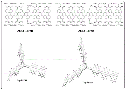 There are many hole transporting materials (HTMs) amenable for O-IPSCs fabrication [82]. However, the use of electron transporting materials (ETMs) has been limited mainly to fullerenes and their derivatives, and there was only few examples of efficient non-fullerene inverted O-IPSCs reported [83-86]. To further enhance O-IPSCs’ performance, we studied the effect of two atomically-precise edgefunctionalized graphene nanoribbons hPDI2-Pyr-hPDI2 and hPDI3-Pyr-hPDI3 (Figure 9), which outperformed PC61BM when used as ETLs in O-IPSCs. These new materials provided a facile fabrication process, high electron mobility, strong light absorption, and HOMO/LUMO levels that matched those of the lead-halide perovskite active layers [87-89].