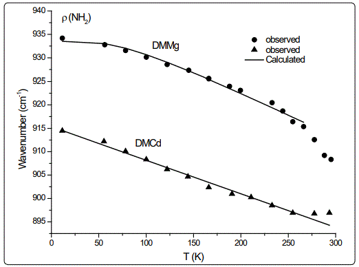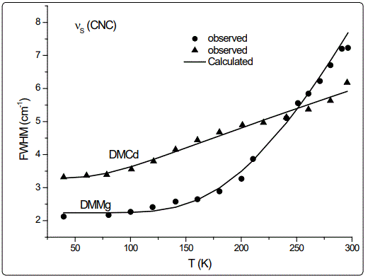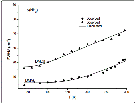 Regarding the IR modes of ρ(NH2) and νS (CNC) as we studied here, the jump discontinuity occurring in the temperature dependence of the IR frequency for the νS (CNC) mode is more apparent (Figure 1) compared to that of ρ(NH2) mode (Figure 2) of DMMg. In the case of those stretching modes of the NH2 group, namely, ρ(NH2) and νS (CNC) of DMCd, their IR frequencies decreasing linearly with increasing temperature (Figures 1 and 2). This behaviour of the IR modes of ρ(NH2) and νS (CNC) indicate that the first order transition exists in DMMg and the lack of any structural phase transition in DMCd, as we calculated from the anharmonic self-energy model, which has also been observed experimentally [8]. Accordingly, although it is not apparent as the IR frequencies of those modes studied, their bandwidths (FWHM) increase non-linearly (DMMg) and a linear (DMCd) increase with increasing temperature (Figures 3 and 4) also indicate a structural transition in DMMg but not in DMCd. It has been pointed out that the FWHM values of the bands related to the methyl moieties do not exhibit significant changes and in the case of DMCd, no splitting of the Raman and IR bands upon cooling has been observed, indicating absence of any structural phase transition in this compound [8]. Additionally, Raman spectra in the low-wave number range do not show any presence of mode softening, which confirms the orderdisorder nature of the phase transition in DMMg.