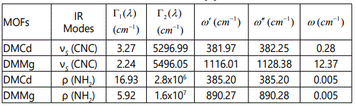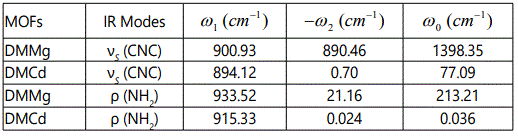 In this study, we calculated the temperature dependence of the IR frequency and line width for the νS (CNC) and ρ (NH2) modes by fitting Equations (4) and (5), respectively, to the observed data [8] in the case of DMMg and DMCd crystalline systems. We give in figures 1 and 2, the wave number calculated for the νS (CNC) and ρ (NH2) IR modes respectively, as a function of temperature according to Eq.(4) for the DMMg and DMCd by using the anharmonic self-energy model. Observed wave numbers for both IR modes [8] are plotted in these figures. The fitted parameters (Equation.4) are given in table 1. Equation (4) was fitted to the observed wave numbers of the νS (CNC) and ρ (NH2) IR modes below TC (=270 K) for DMMg and for all temperatures for DMCd since it does not exhibit any phase transition [8], as given in figures 1 and 2. Figures 3 and 4 give line widths (FWHM) calculated (Equation 5) with the observed data [8] for the νS (CNC) and ρ (NH2) IR modes, respectively, for DMCd and DMMg. They were obtained by fitting Equation (5), to the observed FWHM [8] of those MOFs with the fitted parameters as given in table 2. For the fitting procedure (Equations 4 and 5), the constant ratio ħ/kB was taken unity (=1).