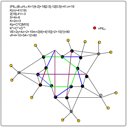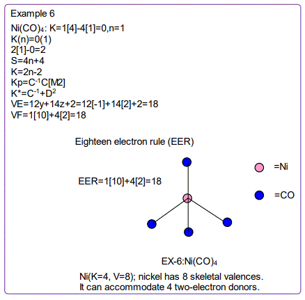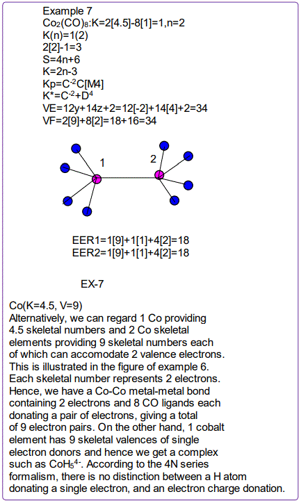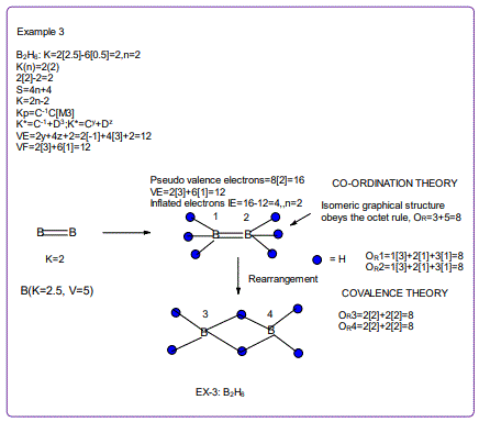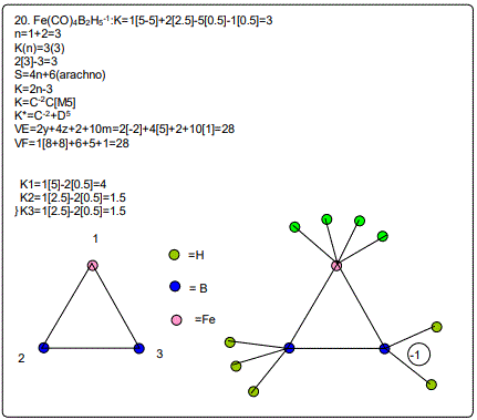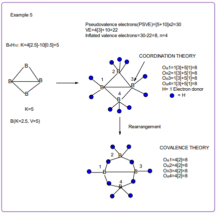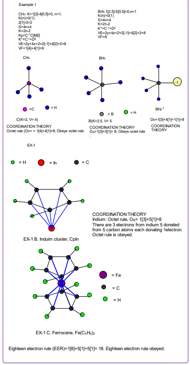 According to the 4N series approach to clusters it makes understanding much easier if we regard each linkage line to a skeletal element(node) as donating 1 electron to the nodal point. In that way, methane, CH4 can be explained as the central carbon atom which has its own 4 electrons receiving donations from the 4H atoms in order to attain the 8-electron configuration. Each of the 4 hydrogen ligands has donated 1 electron to the node and the octet rule has been obeyed. This is the way coordination theory is viewed according to the 4N series approach. This is illustrated in EX-1A. However if we consider BH5, according to the 4N series approach, the node(B) has 3 valence electrons and the addition of 5 electrons to the node will give the node a total of 8 electrons enabling the node to achieve the eighteen electron rule. In fact, the cluster BH5 appears in a disguised form as BH4—.According to the4N series method, there is no difference between a charge of -ve one and 1H ligand donor.