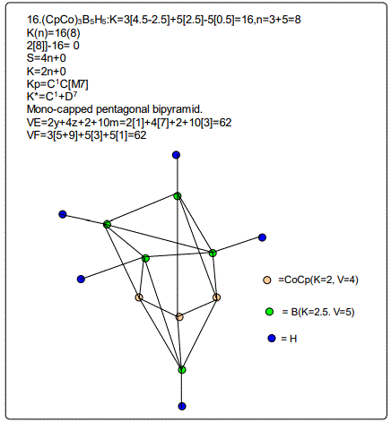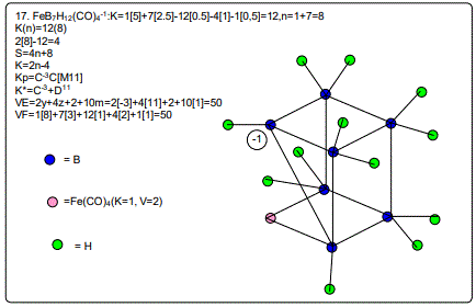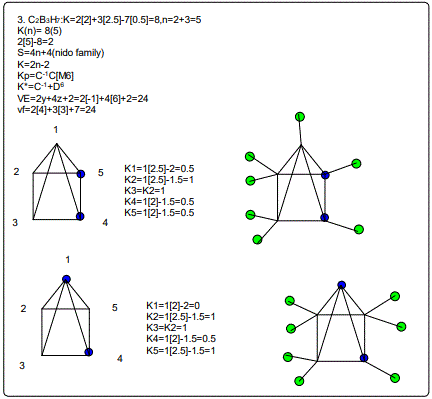 The sample of clusters mainly metaboranes were categorized into clans (Dz) and families (Cy). As can be seen from table 2, they range from D4 to D15 and with families from C-2 to C5. The following clan series of the metalloboranes were identified, D4(1), D5(3), D6(8), D7(4), D9(1), D10(1), D11(1), D12(1) and D15(1). Also some D6 samples were added for comparative purposes. They belong to the family series C1, C2, C3, C4, C7 and C8 of the D6 clan. The isomeric skeletal shape is also provided with explanation for each of the clusters analyzed and categorized. The corresponding isomeric skeletal structures are from figures 1-24. The categorization symbol K*=Cy+Dzcan be viewed as representing a nucleus, Dz and the outer shell Cy. The valence electrons of the cluster comes from the nuclear component which follow the VE1=S=14z+2 while the capping electrons are given by VE2=12y giving the total valence electrons VE=VE2+VE1=12y+14z+2.